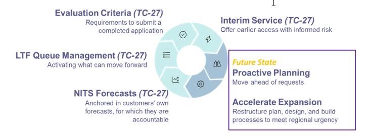 BPA will address NITS Forecasts, Evaluation Criteria, LTF Queue Management and Interim Service in the TC-27 tariff proceeding process. Proactive Planning and Accelerate Expansion discussions are outside the scope of the TC-27 tariff proceeding and are addressed in a separate and distinct Future State engagement series.