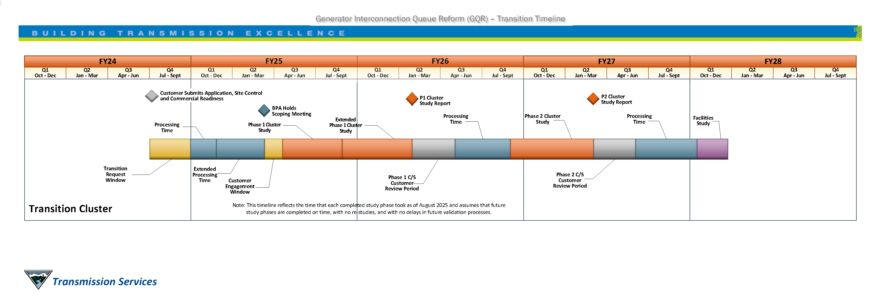 The Transition Cluster Study is currently in the Phase 1 Cluster Study step of the study process. The Phase 1 Cluster Study began on April 19, 2025, and the expected completion date is January 30, 2026. BPA will provide Cluster Study updates via Tech Forum announcement.